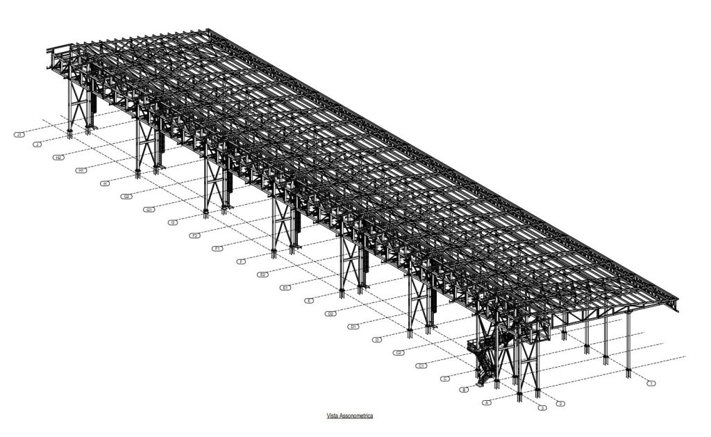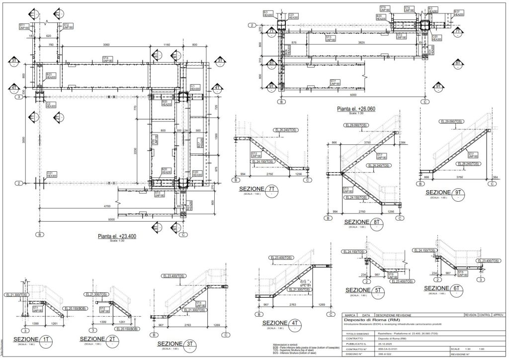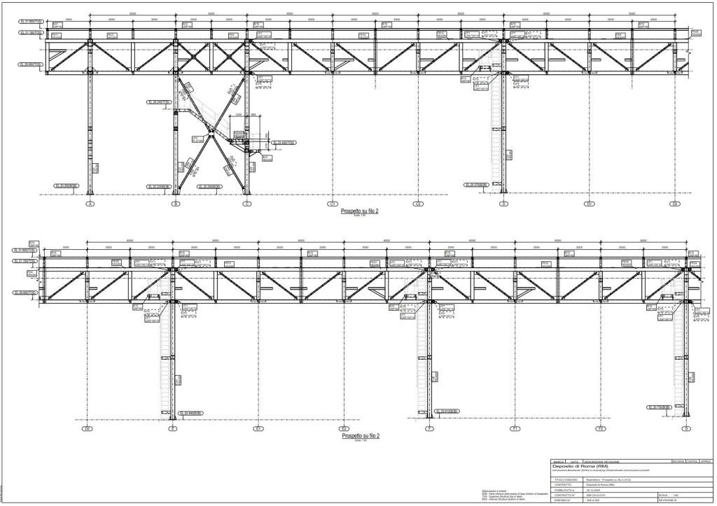 In tempi serrati abbiamo ricostruito il modello e dettagliato la struttura per arrivare a elaborati esecutivi “da officina”: assiemi, particolari, forature, piastre, saldature, tolleranze, oltre a distinte materiali e riepiloghi utili a taglio e fabbricazione.