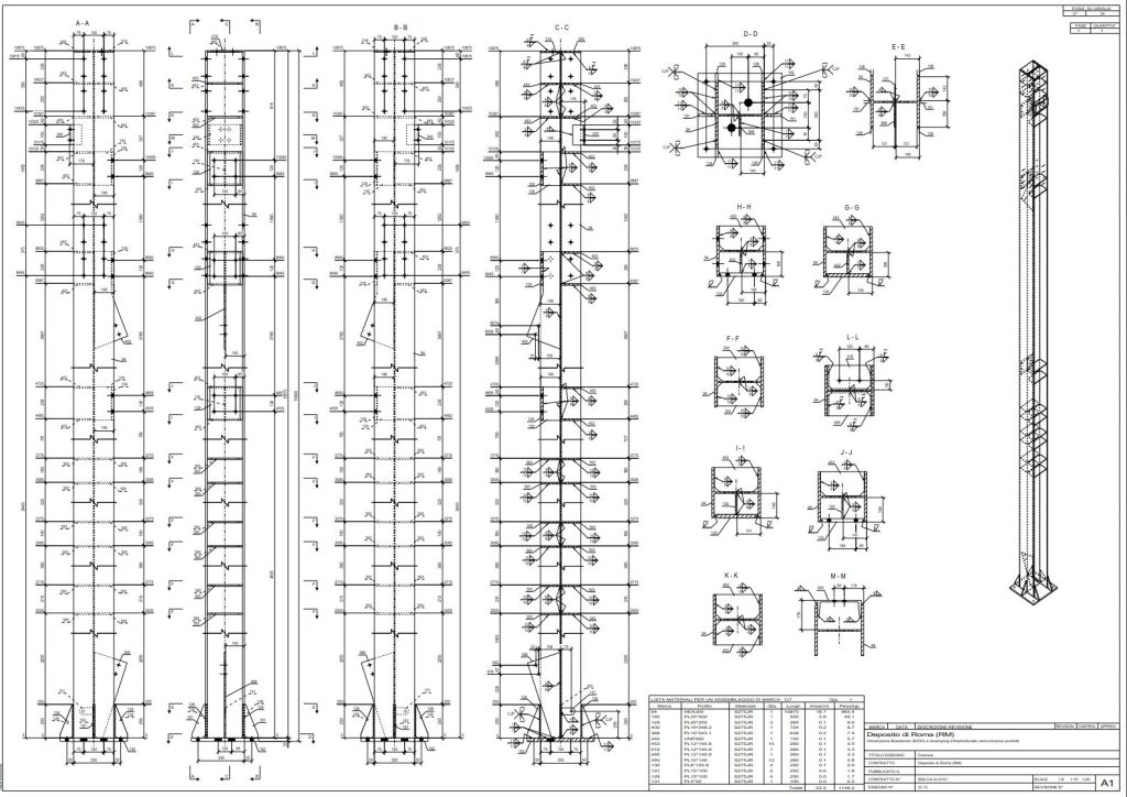 In tempi serrati abbiamo ricostruito il modello e dettagliato la struttura per arrivare a elaborati esecutivi “da officina”: assiemi, particolari, forature, piastre, saldature, tolleranze, oltre a distinte materiali e riepiloghi utili a taglio e fabbricazione.